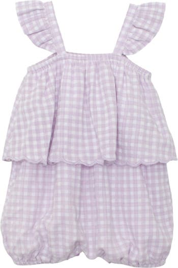 This sweet and airy baby girl romper in a soft, lightweight woven fabric with a lavender gingham check features flutter shoulder straps, a gently gathered neckline, and a tiered overlay with a scalloped edge. Elastic leg openings create a comfy bubble fit, perfect for warm days, playtime, and picture-ready moments. Fabric Care & Content Machine Wash Cold | Line Dry | Do Not Bleach 65% Cotton 35% Viscose Lining: 100% Polyester