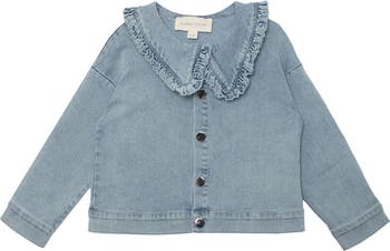 Mabel and Honey Toddler Girls' Light Blue Denim Jacket with Ruffled Collar and Metallic Buttons.