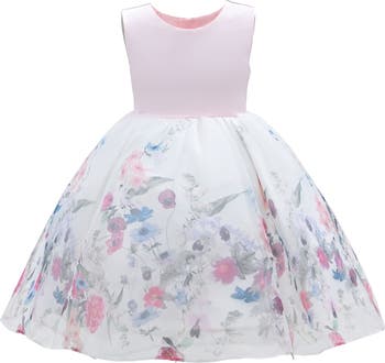 The Mabel Floral Garden Organza Dress is an exquisite choice for any special occasion. This dress features a sleeveless satin round neck bodice that offers both comfort and elegance. Moreover, the magical centerpiece of this dress lies in its dreamy lightweight tulle skirt, adorned with a mesmerizing floral garden design.