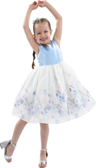 The Mabel Floral Garden Organza Dress is a perfect choice for any special occasion. This dress features a sleeveless satin round neck bodice, offering both comfort and elegance. The magical centerpiece of this dress is its dreamy lightweight tulle skirt, adorned with a mesmerizing floral garden design.