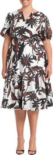 A contemporary floral print in rich shades of black and brown brings modern sophistication to this fit-and-flare midi dress. Designed with a split neckline and short bubble sleeves for soft volume, it features a waist tie that defines the silhouette before flowing into a graceful, flared skirt.