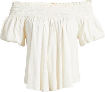A smocked neckline artfully dips off the shoulder in this cotton-blend jersey top cut in a breezy silhouette with bubble-style flutter sleeves.