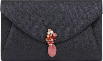Oversized envelope shape glitter fabric clutch, bead cluster &; large stone center piece. This bag comes with a gold snake chain