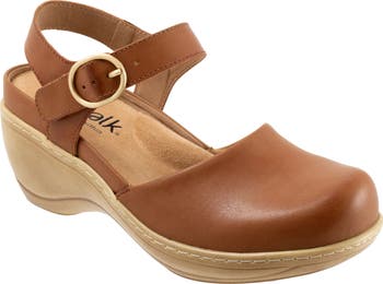 Brushed hardware and nubuck leather lend timeless appeal to a versatile clog set on a cushioned insole and chunky heel.