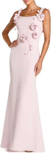 Crepe column gown with a scoop neckline and sculptural 3D rosette detailing across the bodice for a modern, feminine statement.