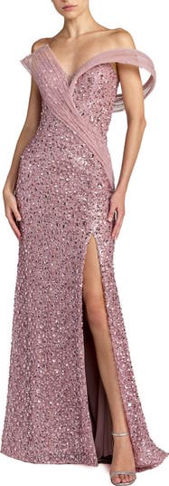Embellished mesh gown with a sweetheart neckline, sculptural beaded drape, and a thigh-high slit for a dramatic, red-carpet-ready look.