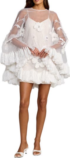 Tulle overlay mini dress with 3D floral appliqué, sequin leaf detailing, and fringe trim over a sheer long sleeve silhouette.