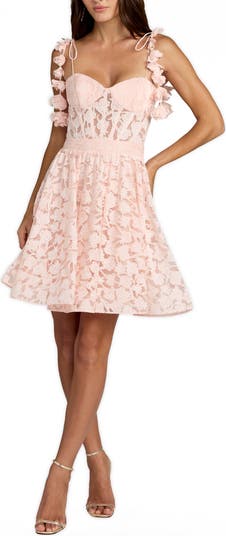 Floral net dress with a sweetheart neckline, 3D flower spaghetti straps, and a bustier bodice flowing into a playful skater skirt.