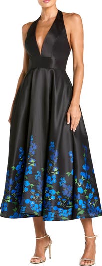 Satin dress with a plunging halter neckline, open back, and floral print at the hem for a sleek, modern silhouette.