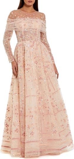 Illusion Neck Long Sleeve Embroidered Ballgown