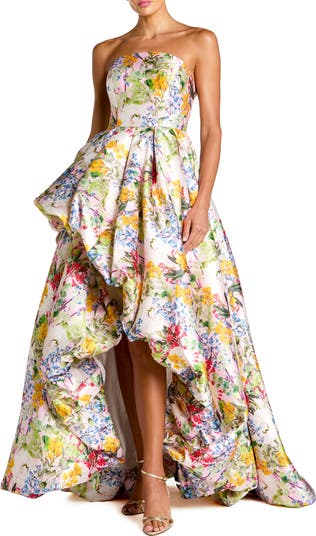 Playful strapless mikado gown with a vibrant floral print and dramatic high-low bubble hem for bold, feminine special-occasion style.