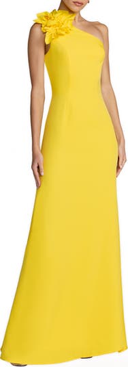 Crepe gown with a one-shoulder neckline and 3D floral detail, finished in a sleek fitted silhouette for a modern, elegant look.