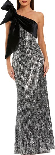 One-shoulder sequin gown with oversized velvet bow detail, designed for red carpet, black-tie weddings, and glamorous evening occasions.