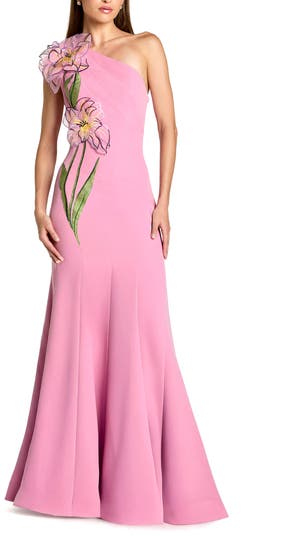 Sleek one-shoulder crepe gown with a sculptural 3D orchid appliqué, fitted silhouette, and softly flared hem for modern elegance.
