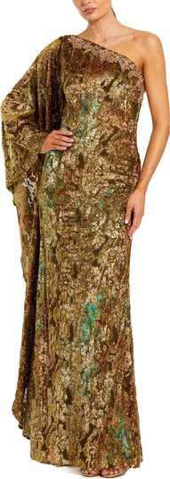 Metallic burnout velvet gown in gold-bronze-olive tones with one-shoulder neckline and draped sleeve—luxurious style perfect for black-tie events.