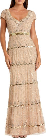 Mac Duggal Petite Beaded Sweetheart Cap Sleeve Tiered Gown, Main, color, Nude