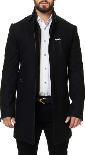 A dapper coat cleanly designed in a structured wool blend with a concealed button closure and inner bib liner handles cold weather with stylish finesse.