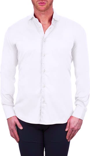 A classic, soft cotton-blend button-up shirt is fashioned with comfortable four-way-stretch that gives you ease of movement and unmistakable style.