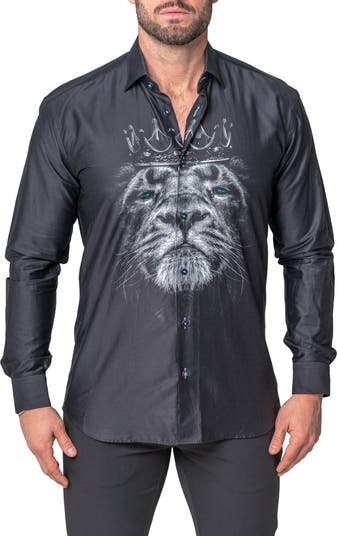 A royal print featuring a fierce lion wearing a crown lends dimension to this regular-fit button-up shirt made from a breezy cotton blend.