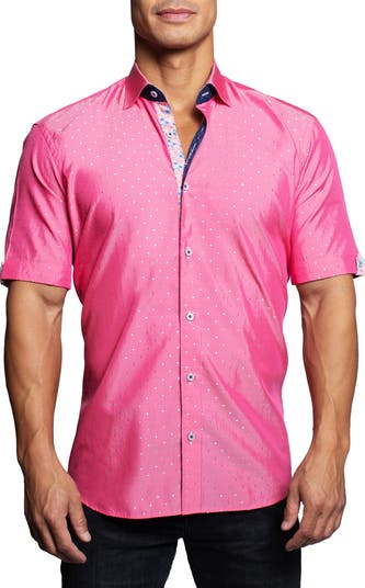 Silvery dots neatly pattern a vibrant pink sport shirt tailored from Egyptian cotton with floral print and checkerboards hiding in the placket and cuffs.