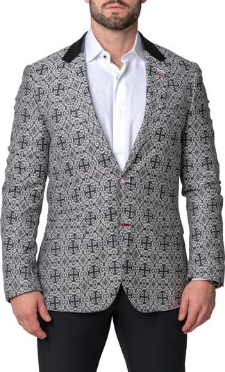 Damask filigrees elevate a sport coat tailored in a physique-hugging fit with black satin colorblocking the lapels and a pull-out pocket square at the chest. It's crafted with a convenient pocket to keep your smartphone stowed and easy to access when you need it.