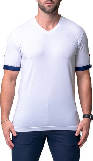 Simple and versatile, this classic V-neck T-shirt pairs the softness of cotton with contrasting bands ringing the sleeves.