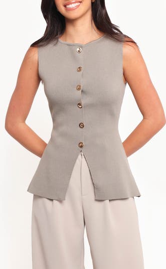 Gleaming goldtone buttons add contrast and styling versatility to this chic sweater-vest featuring a cutaway design at the front hem.