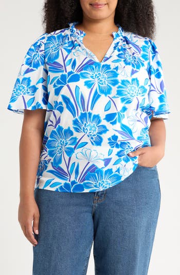 Fluttery short sleeves add playful style to this lightweight cotton top covered in pretty floral print and trimmed with frothy ruffles at the neckline.