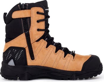 Built for demanding job sites and unpredictable terrain, the MACK TerraPro Honey Black Composite Toe Work Boot delivers dependable protection, comfort, and mobility for long workdays. Designed with ADAPT™ sole technology and an articulated upper, this boot flexes naturally with uneven surfaces while maintaining stability and control underfoot. A convenient side zip allows for quick on and off access, making it ideal for environments where sparks, water exposure, or time sensitive exits are common. The lightweight composite safety toe meets U.S. ASTM safety standards without adding unnecessary bulk, while the low profile toe design helps reduce trip hazards on active worksites. The slip resistant nitrile rubber outsole is heat resistant up to 572°F and fuel oil resistant, providing reliable traction across a wide range of conditions. Retro reflective detailing enhances visibility in low light environments, and a reinforced scuff cap adds durability in high wear areas. Inside, a breathable memory foam insole molds to the shape of your foot, helping reduce fatigue and friction during extended shifts. This boot is a strong choice for professionals who need safety footwear that balances protection, agility, and all day comfort.