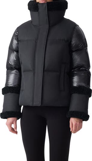 Chill-fighting down, protective two-layer twill and plush shearling trim combine to bring chic comfort and warmth with every wearing of this down jacket that includes a removable, also insulated bib for doubling up on core warmth.
