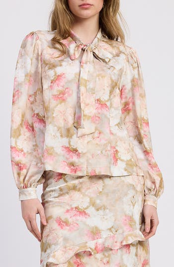 Float through your day in this dreamy satin button-up top featuring a romantic pussybow tie and a delicate floral print that whispers elegance.