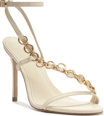 Chain-link hardware saunters down the asymmetric vamp strap on a sleek leather sandal lifted by a stiletto heel and secured with an adjustable buckle closure.