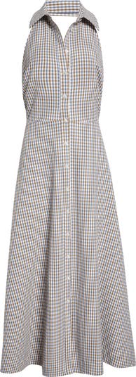 Shirtdress style comes for the sunny season in a cheerfully checked option designed with an open back and mostly made from cool comfortable cotton.