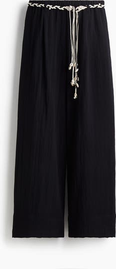 Loose-fit trousers in a crêpe weave with a high, elasticated waist, discreet side pockets and wide legs with pleats at the top. Detachable macramé tie belt.