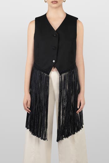 Waist-length fitted vest with button front closure and handmade macrame fringes