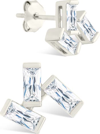 Baguette-cut cubic zirconia catch the light on sterling silver or 14-karat gold-plated cluster stud earrings that bring dainty sparkle to your day.