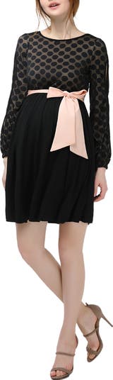 Polka dot lace and tulle make this baby doll dress feminine. Long bell sleeves feature a slit for a dramatic look. A keyhole at the back neck and self-tie belt add the perfect finishing touches.