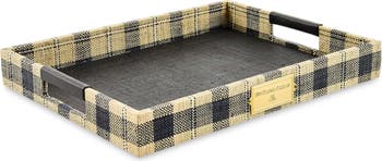 Serve cocktails and snacks with a little extra swagger on this rectangular serving tray crafted in woven raffia with faux-leather accents.