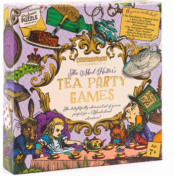 MAD HATTER'S TEA PARTY GAMES - The delightfully whimsical set of games, perfect for a wonderland adventure! Mad? It’s entirely bonkers! Topple down the rabbit hole into a whole new world of fun with this 6 in 1 game set! Bursting with beautiful illustrations and classic games all with a quirky storybook twist, this set is perfect for your next Hatter’s tea party! Paint the white roses red in Reversi, match up the Alice inspired story cards, or see how well you know your favorite literary characters in Bigger Taller Smaller. Play each game individually or host your own topsy turvy tournament of fun – just don’t lose your head! Inspired by Lewis Carroll's world of literary nonsense, where croquet games are played with flamingos, tea parties are never ending, and a raven is very much like a writing desk. Centered on Carroll's spirit of playful mischief, this collection will capture the imaginations of young and young at heart alike. Ages 7 and up. 6 ALICE IN WONDERLAND INSPIRED GAMES INCLUDED: The Mad Hatter's Category Game, Alice's Story Cards, The Mad Hatter's Tea Party Picture Puzzle, The Caterpillar's Challenge "Bigger, Taller, Smaller", Paint the Roses (Reversi) and The Queen's Tic Tac Toe.