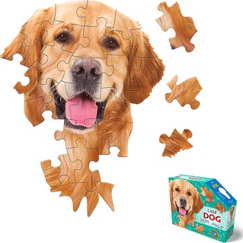 MADD CAPP: I AM DOG - 24 PIECE PUZZLE - Part of the Family! Unique, animal head-shaped 24-piece jigsaw puzzle for ages 3 and up. Poster-sized when completed. Puzzle pieces are oversized for easy handling. Each puzzle comes with an educational Madd Capp Fun Facts booklet. On one side is a fold-out puzzle image to hang as a poster or use as a reference. The flipside is chock-full of cool information! Did you know, for instance, that dogs love naps? Most of them sleep up to 14 hours a day! 24 INTERLOCKING PIECES: Finished size: 14" x 18" (poster size). Unique animal head-shaped border. No square corners, no straight edges… just a little extra challenge and a lot more fun. Large pieces are sized just right for small hands to hold and manipulate (good for folks with limited dexterity too). Semi-gloss, photo-realistic image. Mounted on premium quality chipboard (dust-free!). Random cut, interlocking puzzle pieces are thick and sturdy. Puzzle pieces come fully separated with cleanly cut edges that fit together snugly. Makes amazing wall décor. Glue it, then mount the masterpiece! PACKAGED in Madd Capp’s signature five-sided box – durable, tamperproof, and sized just right to secure 24 puzzle pieces. Box size: 9" x 7" x 3". Pieces come packed in a biodegradable and compostable bag. Includes Madd Capp Fun Facts and full puzzle image. Sustainably sourced and recycled materials. No single-use plastics. Also available as a 550-piece 24" x 32" poster-sized puzzle!