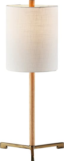 Illuminate your room with the simple, natural style of this lamp with a tripod base in antique brass supporting a slender light oak wood stem. The table lamp is topped by a tall drum shade made of white textured fabric to softly diffuse light.