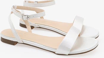 Elegant satin flat sandals featuring an ankle strap for added comfort and support. A versatile style that pairs beautifully with both dresses and casual outfits. Perfect for weddings, bridal showers, engagement events, and other special celebrations.