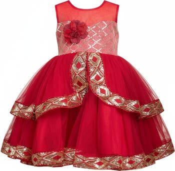 Festive fashion your fashionista will flip for is here to enchant her formal holiday attire. Adorned with floral applique and an adorable two-tier tulle shirt with embroidered hems, she'll look just like a little princess.