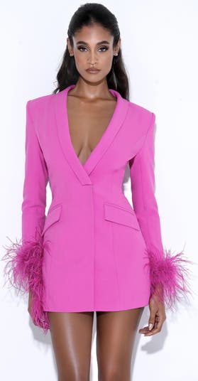 This classic Miss Circle blazer dress combines sophistication with playful details. Featuring a sexy low "V" neckline and our signature double-breasted fit with pockets, the mini length and long sleeves are adorned with a chic feather trim. The side thigh cutout adds an extra element of allure with feather trim on the slit edge. Internal silver snap closures down the center front ensure a fitted look. Fully lined and made of luxurious woven stretch crepe fabric with feather trimming details, this dress is versatile for work or any special occasion you want to turn heads at. Available in black, pearl white, and fuchsia, the Madeline dress offers a timeless and fashionable choice for your next event.
