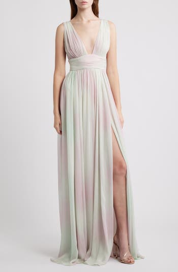 Float across the dance floor in this ethereal gown made with a plunging neckline and accented with soft gathers for texture and graceful movement.