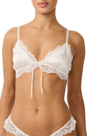 Delicate ties fall from the front of this lace-trimmed bralette made of soft satin.