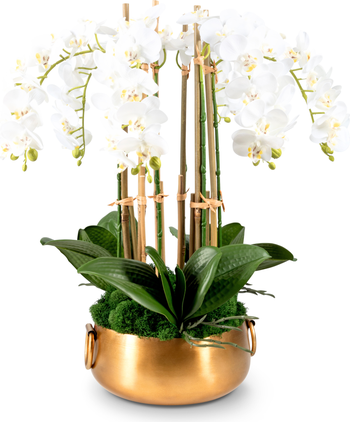 Experience the unparalleled beauty of our exclusive petite RealTouch Orchids in The Madelyn RealTouch Orchid Arrangement. Meticulously designed to grace any tabletop or side table with its timeless elegance, these orchids are set in a gold handle vessel. Perfect for gifting or enhancing your own space, the Madelyn RealTouch orchids offer unmatched realism and sophistication.