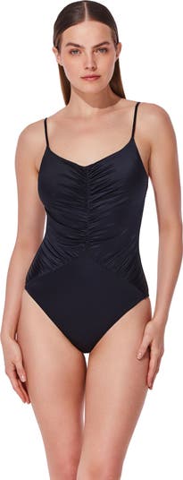 Get ready to shine in satin with this effortlessly chic one-piece. The Mademoiselle V Neck Ruched One Piece features removable soft cups, adjustable straps, modern bottom coverage, and full front and back lining for all-day comfort.