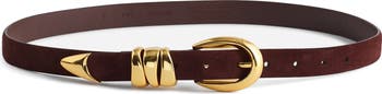 A staple suede belt gets a contemporary update with a shiny oval buckle and trio of molten keepers.
