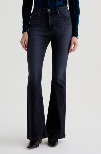 Rock a dramatic, '70s-inspired silhouette in full-length flare jeans featuring a high waist, trouser-style hems and stretchy Italian denim.